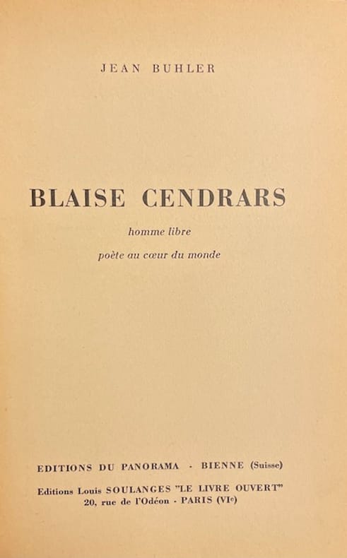 Bienne, Paris, Edition du Panorama, Edition Louis Soulanges "Le livre ouvert", 1960. In-12 broché de 154-[4] pages, couverture cartonnée, jaquette illustrée d'une photographie de Cendrars. Jaquette frottée en tête, édition en très bon état néanmoins. Maison Gutmann.