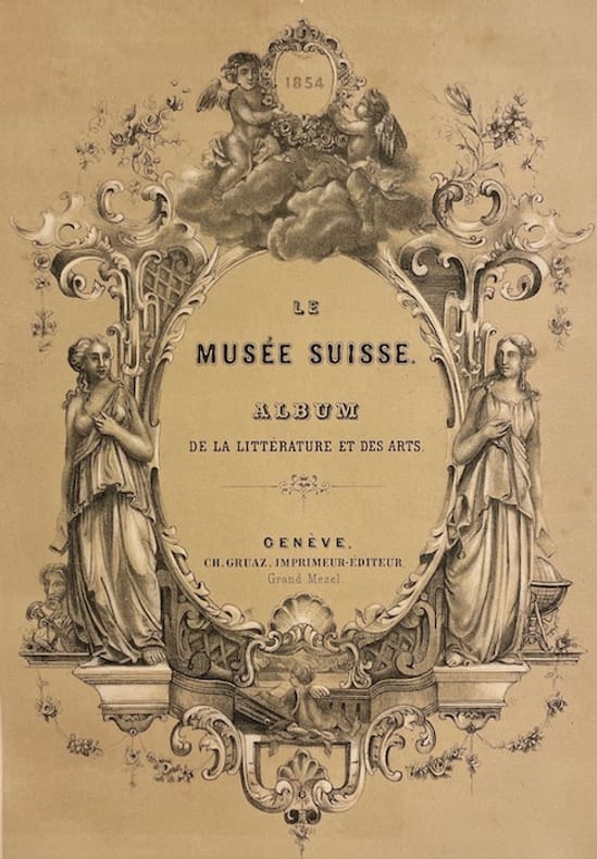 Les 24 planches lithogr.: Tome 1: 1) Calame: un coin de bois à Jussy /2) la vestale voilée. Statue de R. Monfi / 3) Fontanesi: Souv. d.l. Vallée de Moutier / 4) NEAFF: La Tour de Gourze /5) HEBERT: Mère et enfant / 6) CASTAN: Une ferme en Savoie /7) (Portrait mi-figure: J.J. Pradier /8) J. Rochenstein: Galathée repr. p. Mme Cabel / 9) J. BAKOF: Bucherons / 10) A. Topfer pinx (sic) - Jh. Burdallat sc.: A Vernaz (Ct. de GE) / 11) Hébert: (Portrait mi-figure de:) A. Calame. /12) J. Bakof: Un hermitage. Table des textes: Les résidents de France à Genève 1679-1798 / Souvenirs de J.J. Pradier / H. de Tilly: Une ascension à la cime du Mont-Blanc (relation de la première ascension française du Mont-Blanc en 1834) / Dr. Frankallaya: Kashmir, préparatifs nécessaires pour un voyage dans ce Royaume / Sur le Saint-Bernard (fragment) de Chateaubriand / Joseph Burdallet, souvenirs personnels / Mme de Stael, livre des passions e.a.Tome 2: planches: 1) FONTANESI: Le Château de Glérolles (Lac de Genève) / 2) Hébert: (Portrait mi-figure:) L. Vulliemin / 3) RUBIO; Après la bataille de Grandson (le pillage) /4) Fontanesi: Embouchure du Rhône (Lac de GE avec barque typique) / 5) Delapeine pinx. - TERRY lith: À Neuvecelle près d’Èvian (Lac de GE) / 6) Fontanesi: À Saint-Gingolph (La de GE) /7) Gughielmi-Rubio (Portr. mi-figure:) Bungerer / 8) Hébert: Charlemagne à Genève / 9) GANDON: L’Avoyer Wengi à Soleure /10) d’après GASTAN: Vallée de Gadmen (près de Meyringen) / 11) Entrevue de Henri IV et de Théodore de Bèze (d’après Gandon) /12) A. Gandon: Bataille de Mellingen. Table des textes e.a.: Mind le peintre des chats, par L. Vuillemeir / Alliances des dixains du Vallais et des Alpes grisonnes avec les Suisses / Une promenade dans le district de Monthey (Valais). etc. etc. Image disp.