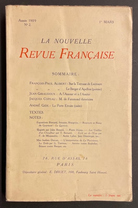 Edition originale. Deuxième numéro de la prestigieuses revue. Edition pré-originale de M. Faramond théoricien de Jacques Copeau. Contributions d'André Gide (La Porte étroite, suite), François-Paul Alibert, Jean Giraudoux et Jacques Copeau. Exemplaire en parfaite condition.