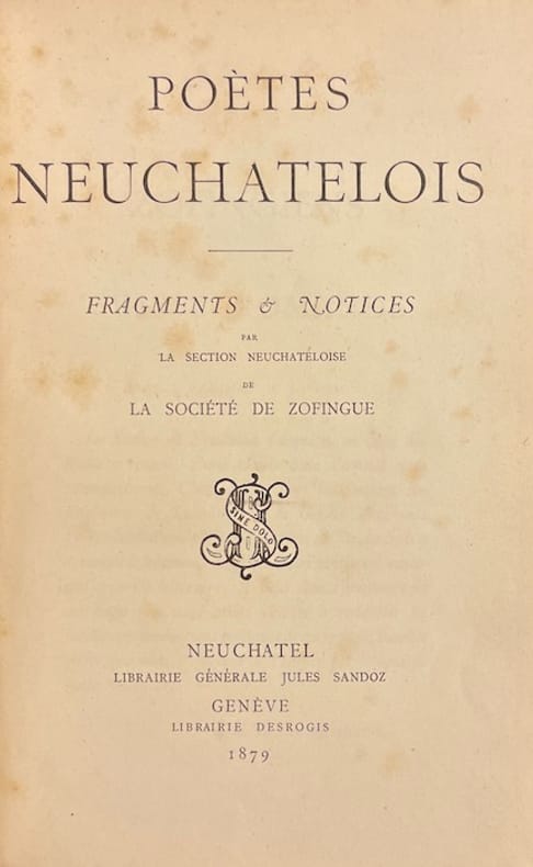 Neuchatel - Genève, Librairie Générale Jules Sandoz - Librairie Desrogis 1879, 180x120mm, 404pages, reliure d'éditeur. Percaline, auteur, ornementations et filets dorés au dos. Ornementations et encadrements dorés sur le plat supérieure. Encadrements et filets à froid sur le dos et les deux plats. Tranches dorées.