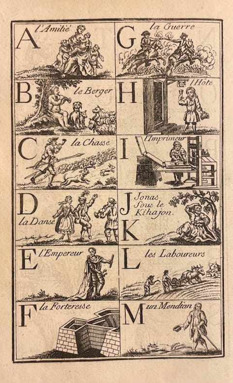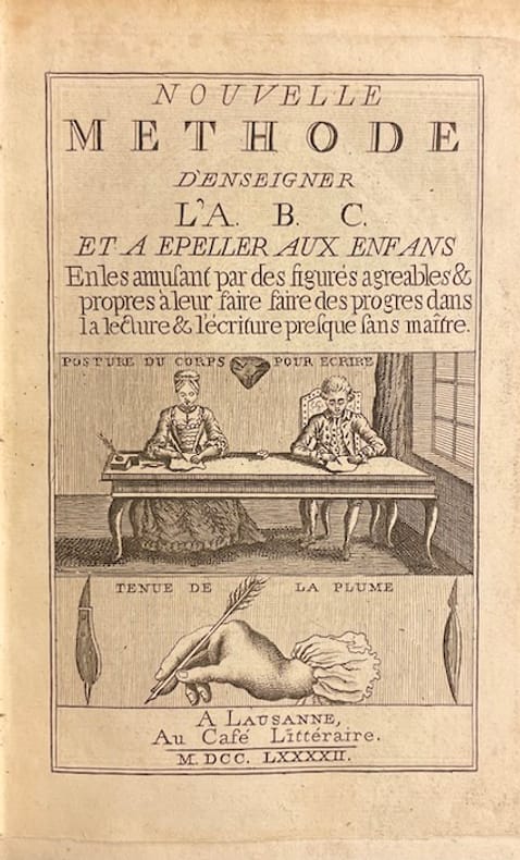 Contrefaçon des éditions parues au Locle en 1785 et 1786. Illustré de 47 planches gravées (dont 2 p. d'abécédaire et 4p. de vocabulaire imagé). La carte de Neuchâtel que l'on trouve en fin de volume dans les éditions neuchâteloises a été remplacée par une carte de la Suisse. Exemplaire en excellente condition. [Lonchamp 1241]