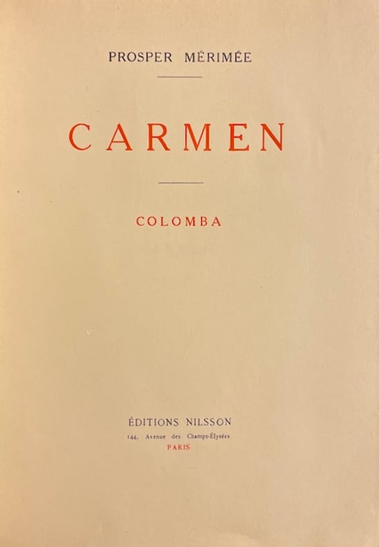 La Bibliothèque Française, 1949. Editeurs Français Réunis. 1954. Un volume in-folio en feuilles sous couverture carton recouverte de papier vélin d 'Arches remplié, titre imprimé sur le front. Emboîtage en carton recouvert de toile de jute, titre imprimé en rouge sur le dos. - 3 AQUATINTES datées sur le cuivre 30.4.49,I,II ou III. (40,7 x 30,5cm). - 1 POINTE-SÈCHE datée sur le cuivre 24.10.60 (20x14,8cm). - 1 LITHOGRAPHIE EN COULEURS « Toreros y Senorita » sur papier report, datée 24.10.60 et 4.11.60 (34,2x23cm). Les 5 épreuves sont numérotées 185/245 et présentées dans un feuillet vélin d'Arches plié en deux inséré dans l'ouvrage. Edition à 275 exemplaires : l'un des 245 exemplaires sur vélin d'Arches, numérotés de 1 à 245, le nôtre porte le N°185, SIGNÉ PAR PICASSO ET ARAGON. Exemplaire en parfait état. (Cramer 126, Bloch 1000 à 1005). Photographies supplémentaires sur demande. - ENGLISH : Pablo PICASSO - Prosper MERIMEE – Louis ARAGON. LE CARMEN DES CARMEN. With three aquatints, one drypoint and one lithograph in color by Pablo Picasso, each numbered 185/245 in pencil. La Bibliothèque Française, 1949. Editeurs Français Réunis. 1954. Portfolio with three aquatints (40,7 x 30,5cm), one dry-point (20x14,8cm), and one lithograph in colors (34,2x23cm), by Pablo Picasso, loose as issued, title, justification page, and text with numerous illustrations in color (printed in lithograph) and border decorations also by Picasso. THE BOOK IS SIGNED BY PICASSO AND ARAGON on the justification page. One of 245 copies on Arches wove paper (n°185), perfectly preserved in the original publisher box (reference : Bloch. 1000-1005 ; Cramer books 126).