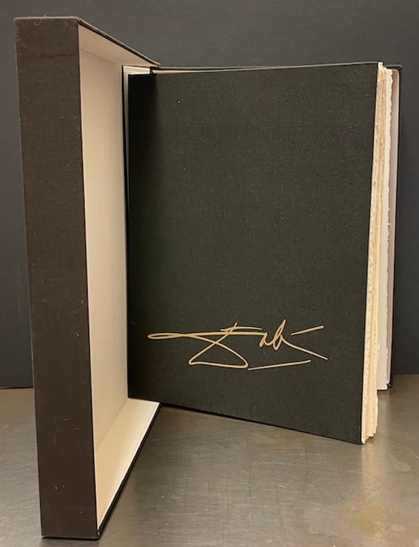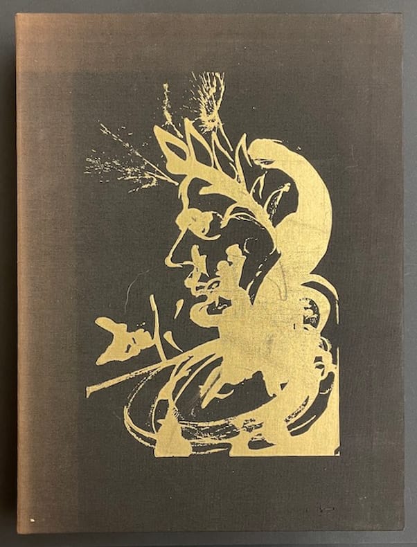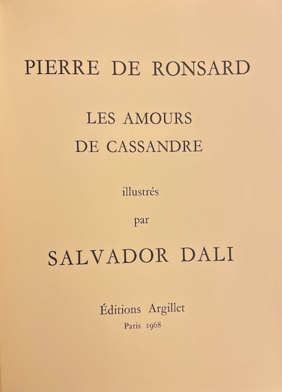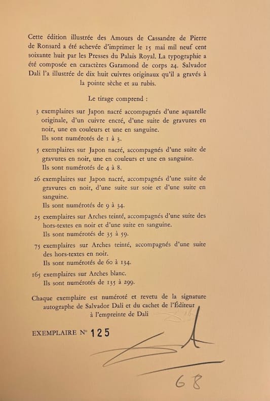 Argillet/Grafik Europa Unstalt, Paris 1968. Un volume in-4 (380 x 280 mm) en feuilles sous couverture imprimée rempliée, portefeuille interne rigide toilé noir et emboitage rigide recouvert de toile noire illustrée d'une composition dorée d'après l'artiste. - 18 GRAVURES ORIGINALES DE SALVADOR DALI À LA POINTE-SÈCHE ET AU RUBIS, DONT 17 EN HORS-TEXTE, soit 10 à pleine-page (35,5 x 25,5 cm), 7 plus petites également en hors-texte, et une dernière en cul-de-lampe d'une page de texte. Chacune des 10 gravures à pleine-page est revêtue de l'empreinte de la signature de Dali, en bas à droite de la feuille. - Édition : 299 exemplaires. Celui-ci étant l' 1 des 75 exemplaires numérotés sur vélin d'Arches teinté (n° 120), SIGNÉ AU CRAYON PAR DALI et daté '68. - AVEC UNE SUITE SUPPLÉMENTAIRE DES 10 PLANCHES HORS-TEXTE PORTANT LA SIGNATURE ESTAMPÉE EN BLANC DANS LA MARGE INFÉRIEURE. Soit un ensemble de 28 gravures originales. État parfait. L'exemplaire est à l'état de neuf. References : Field 68-2 (p. 42-43) / Michler & Lopsinger 248 to 265. -- ENGLISH DESCRIPTION: RONSARD : LES AMOURS DE CASSANDRE. 18 original dry-point by Salvador Dali. With an extra suite of the out-of-text plates (1968). Argillet/Grafik Europa Unstalt, Paris 1968. - 18 ORIGINAL ENGRAVINGS BY SALVADOR DALI IN DRYPOINT AND RUBY, ALL OUTSIDE TEXT. (10 full-page and 8 smaller out of text too). Each of the 10 full-page engravings bears the imprint/embossed of Dali's signature, at the bottom right of the sheet. Edition: 299 copies numbered, signed and dated. This is 1 of 75 numbered copies on tinted Arches paper (n° 120) WITH AN EXTRA SUITE OF THE 10 LARGE SIZE HORS-TEXTE. THE BOOK IS SIGNED IN PENCIL BY DALI and dated '68. The book is complete and in perfect condition in the original decorated black linen shell-box. References : Field 68-2 (p. 42-43) / Michler & Lopsinger 248 to 265. More pictures in request. Right mouse click for a full screen picture.