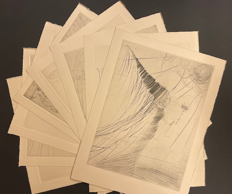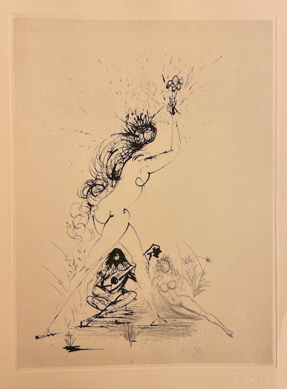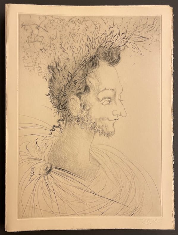 Edition de luxe tirée en tout à 299 exemplaires et illustrée de 18 gravures originales de Dali gravées à la pointe-sèche et au rubis (à savoir 10 gravures à pleine-page revêtues de la signature à sec de l'artiste, 8 gravures à grandes marges). Celui-ci est un des 75 exemplaires numéroté sur Arches, signé à la mine de plomb par Dali à la justification et accompagné d'une suite en noir des 10 gravures à pleine-page.