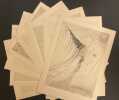 Les Heures Claires Feuilles sous couverture et emboîtage 1957 "Trois volumes in-8 (20 x 25 cm), exemplaires en feuilles sous couverture rempliée et emboîtage, 174 pages chacun, trois oeuvres de Ronsard illustrées par Marty : ""Sonnets pour Hélène"" // ""Les Amours de Cassandre"" // Les Amours de Marie"", 1 des 1650 exemplaires sur vélin pur fil de Rives ; zones brunies et traces dont quelques mouillures sur les emboîtages, une arête fendue à l'étui des ""Sonnets pour Hélène"", plats un peu roussis, par ailleurs intérieur frais, assez bel état. Livraison a domicile (La Poste) ou en Mondial Relay sur simple demande."