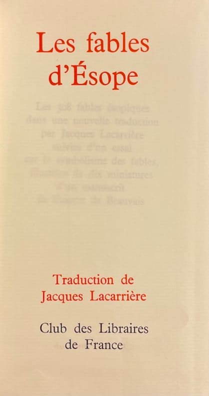 Edition hors commerce numérotée. Les 308 fables ésopiques dans une nouvelle traduction par Jacques Lavarroière, suivies d'un essai sur le symbolisme des fables, illustrés de dix miniatures d'un masuscrit de Vincent Beauvais. Bel exemplaire.