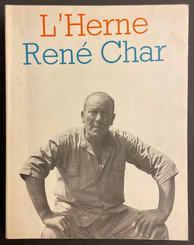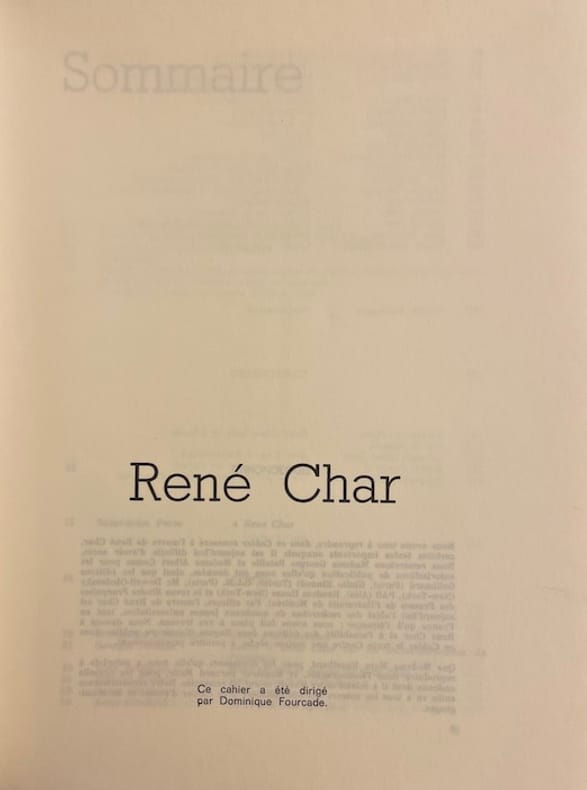Supplément au n° 76 de la revue marseillaise SUD, paru après la mort de René Char, avril 1988. Plaquette in-8° agrafée. 20 pages. E.O. Propre.