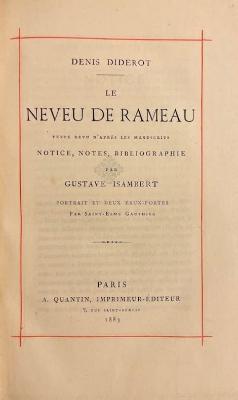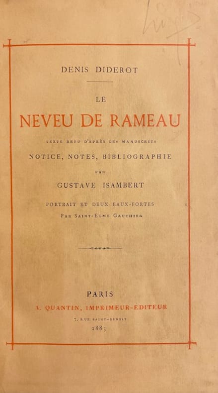 Paris, Plon, Nourrit et Cie, 1891 ; in-16, percaline rouge de l’éditeur, décorée à la plaque, Bibliothèque Elzevirienne, titre, sphère armillaire et édition dorés au dos, non rogné (cartonnage de la Bibliothèque Elzévirienne) ; XXXII, 232 pp., [2] ff. de Table et nom d’imprimeur ; 2 fac-similés dépliants sur chine, de la première page du manuscrit holographe du Neveu de Rameau et de la page de manuscrit contenant le texte de la fin de la pièce.