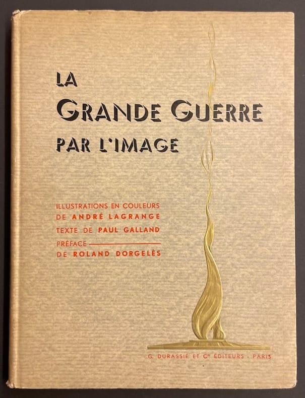 Trois anciens de la Guerre André LAGRANGE -peintre-, Paul GALLAND -écrivain- et Gustave DURASSIE -éditeur- ont réalisé cette oeuvre à l'intention des enfants de France, pour qu'ils apprennent et n'oublient jamais l'héroïque et douloureuse histoire de tous ceux qui furent, de 1914 à 1918, les combattants. "Le souci d'entretenir la flamme du souvenir auprès des enfants se traduit par l'omniprésence de la guerre dans les publications enfantines de l'après-guerre" (in "Livre Mon Ami - Lectures Enfantines 1914-1954" L'Heure Joyeuse pp.20). De très nombreuses illustrations en couleurs accompagnent ce récit poignant.Tirage limité à 550 exemplaires. Un des cinq cents exemplaires sur vélin pour fil Lafuma.. Infimes usures à la reliure, manque la carte dépliante in-fine.
