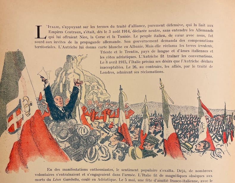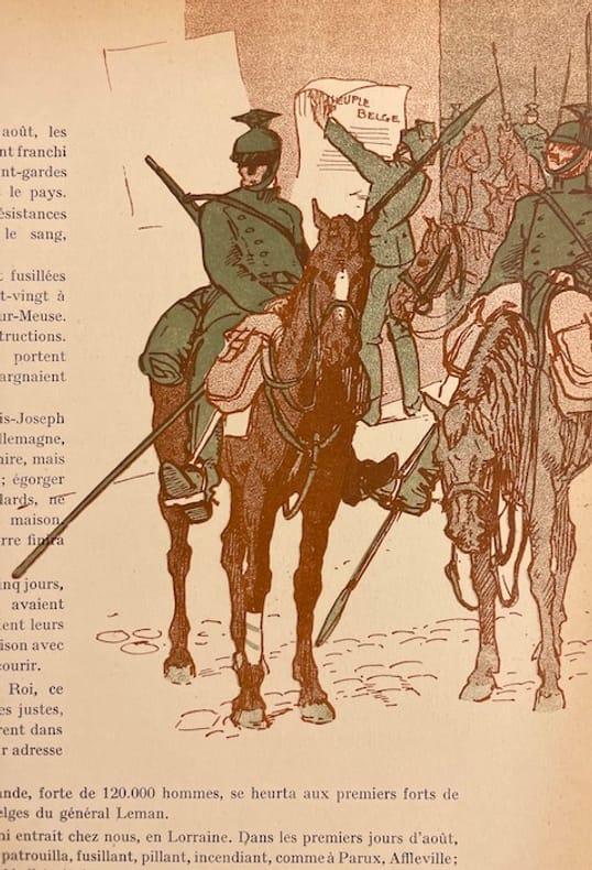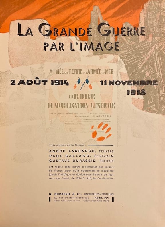 "Trois anciens de la Guerre 1914-1918, André Lagrange, peintre, Paul Galland, écrivain, Gustave Durassié, éditeur, ont réalisé cette oeuvre à l'intention des enfants de France, pour qu'ils apprennent et n'oublient jamais l'héroïque et douloureuse histoire d'une longue et sanglante guerre.."