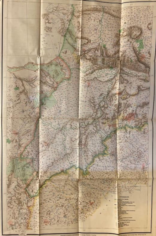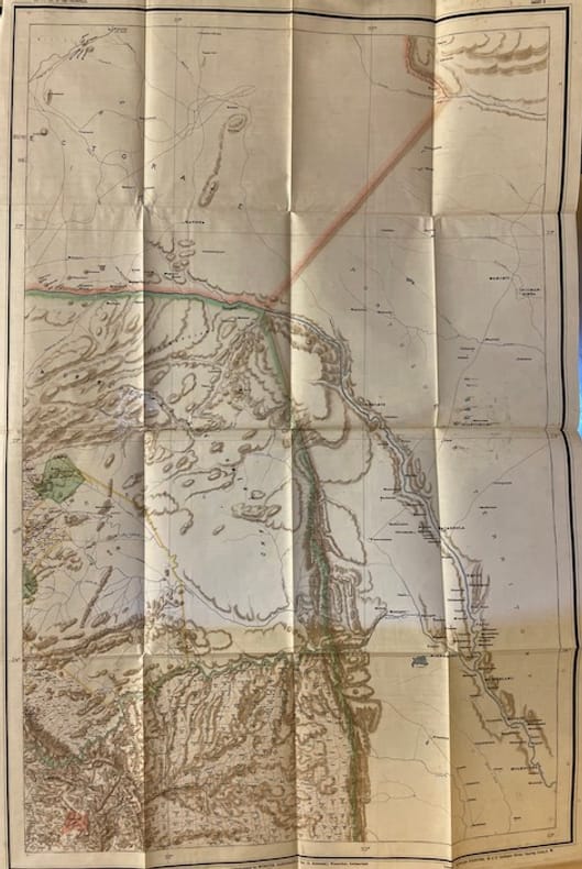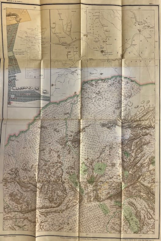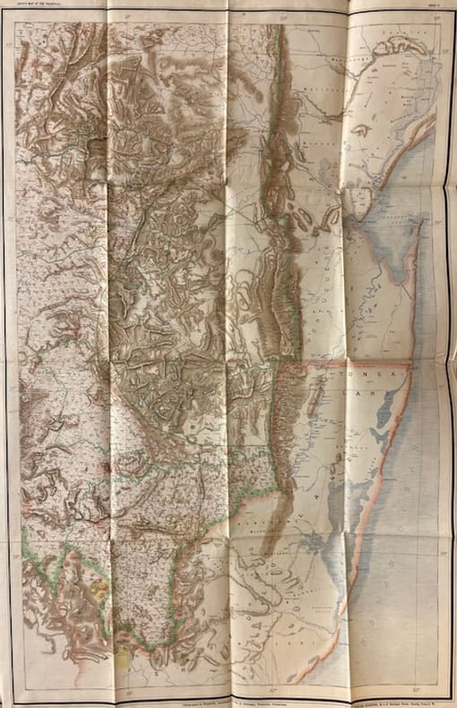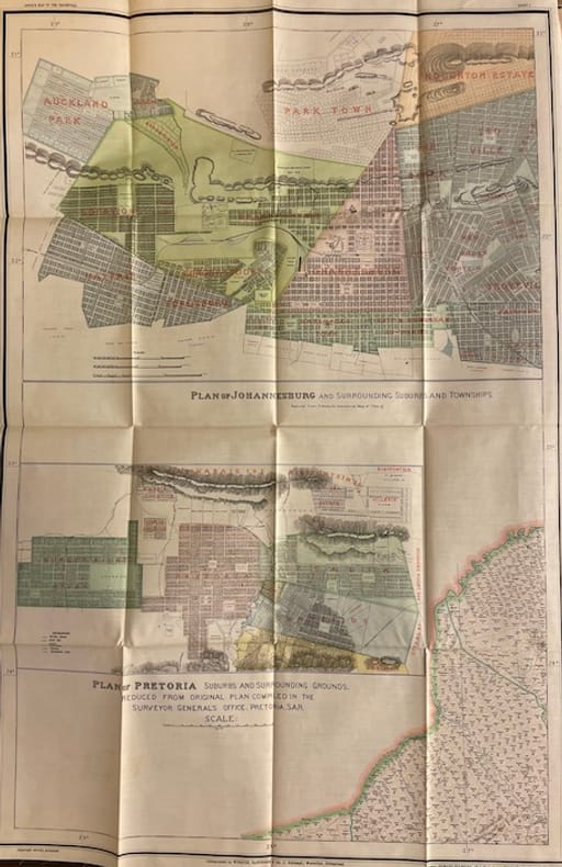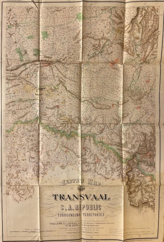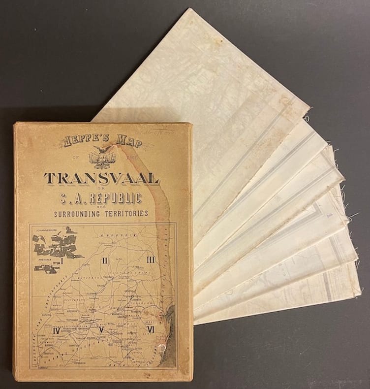 Carte originale en couleur, lithographée, du Transvaal (196 x 195 cm au total), imprimée sur soie cirée en six feuilles pliantes non jointes (98 x 65 cm chacune). Rangées dans un étui en papier d'origine de l'éditeur imprimé en noir avec une version miniature de la carte sur la partie supérieure. Avec des plans encartés de Johannesburg et Pretoria en haut à gauche de la feuille. Carte à grande échelle du Transvaal en 1899, à la veille de la Seconde Guerre des Boers, publiée à Pretoria, République sud-africaine, et imprimée à Wintherthur, en Suisse , par Jakob Schlumpf en utilisant sa technique de chromolithographie sur soie cirée. La carte a été co-publiée par Edward Sandford à Londres, dont l'empreinte apparaît dans la marge inférieure. Une mouillure sur l'étui (voir photo), sinon à l'état de neuf.