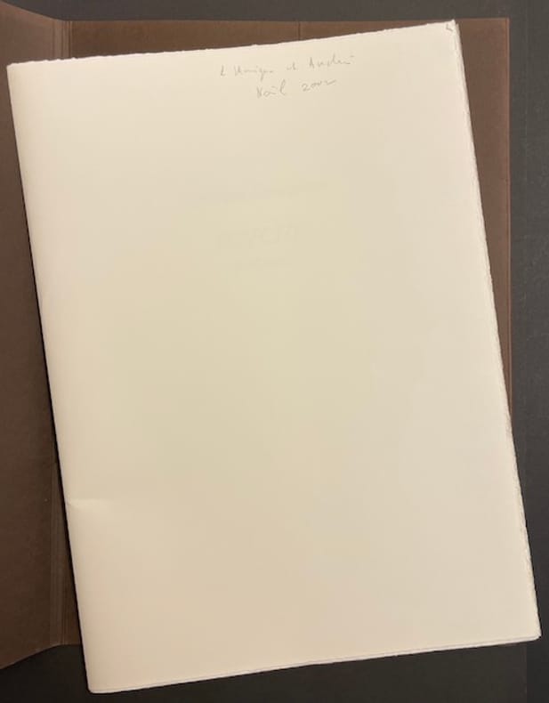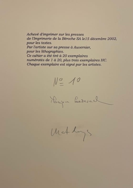 [Auvernier, chez l'artiste et Saint-Aubin, Imprimerie de La Béroche], 2002. In-folio (28 X 39 cm), non paginé, en feuilles, sous portefeuille muet.