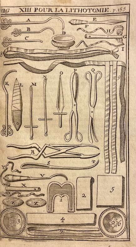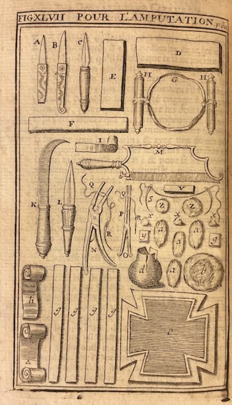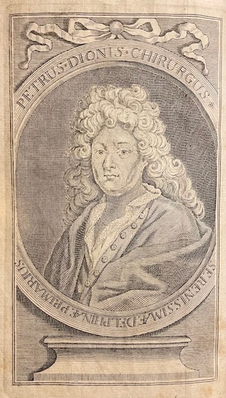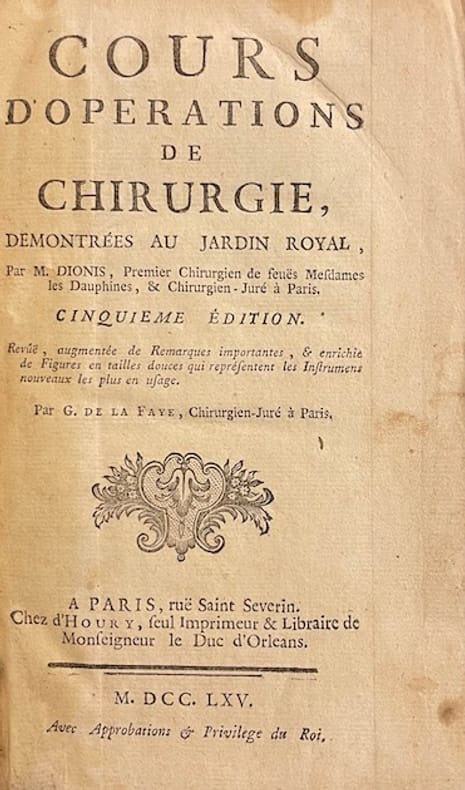 Cinquième édition. Revûë, augmentée de Remarques importantes, & enrichie de Figures en tailles douces qui représentent les Instruments nouveaux les plus en usage, par G. de la Faye, Chirurgien-Juré à Paris.Avec un portrait en frontispice, une gravure dépliante du Jardin royal et 65 gravures dont 14 en pleine page représentant principalement des instruments chirurgicaux. Traces d'usage à le reliure, coins émoussés, coupes usées, coiffes absentes.Le Cours de Chirurgie de Pierre Dionis (première édition 1707, réédité tout au long du XVIII siècle) est un ouvrage qui a eu un immense succès en Europe, car il se voulait à la fois clair, pédagogique et accessible aux étudiants et aux praticiens. Il est organisé en dix démonstrations, comme des leçons pratiques, chacune centrée sur une partie du corps ou une grande question chirurgicale.