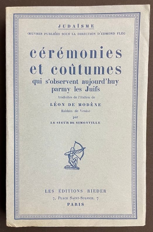 Paris Rieder, coll. "Judaïsme" 1929 1 vol. broché in-12, broché, 215 pp. Description du rituel orthodoxe par le rabbin de Venise (1571-1648). Un des 120 exemplaires numérotés sur vélin pur fil Lafuma de Voiron, seul grand papier, et parmi ceux-ci l'un des 20 hors commerce. Très bon état.
