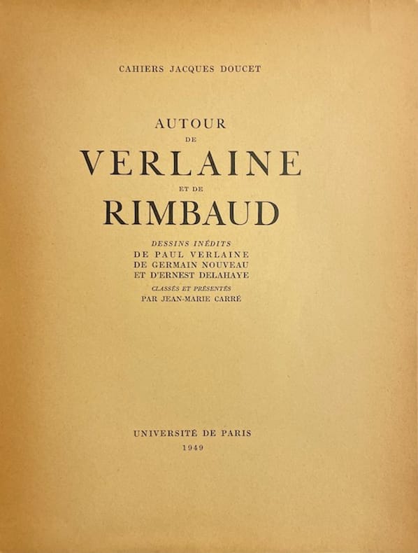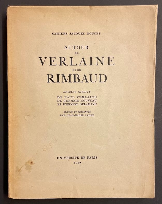 Dessins inédits de Paul Verlaine, Germain Nouveau et Ernest Delahaye, présentés et classés par Jean-Marie Carré. Un des 1400 exemplaires numérotés sur vélin. Une tâche en première de couverture, dos consolidé, autrement bon exemplaire.