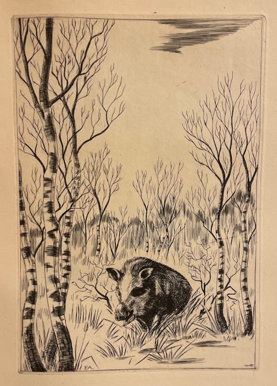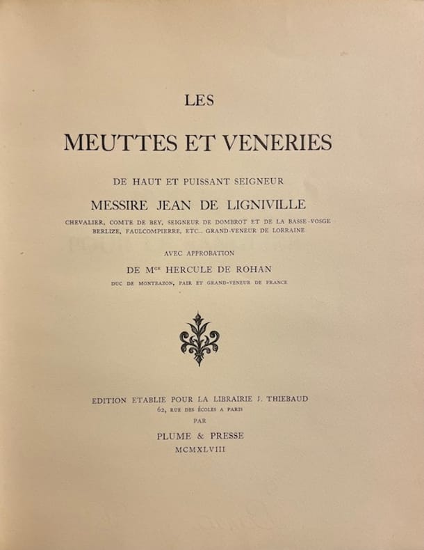 [...] Les meuttes et veneries de haut et puissant seigneur Messire Jean de Ligniville chevalier, comte de Bey, seigneur de Domdrot et de la Basse-Vosge Berlize, Faulcompierre, etc... Grand Veneur de Lorraine. Avec approbation de M Hercule de Rohan duc de Montbazon, pair et grand-veneur de France. Cet ouvrage tiré à 300 exemplaires numérotés et orné par F. Allain a été achevé d'imprimer le 30 juin 1948 par E. Baudelot, imprimeur à Paris. Orné de bandeaux et de culs-de-lampe par F. Allain. Exemplaire à l'état de neuf non coupé.