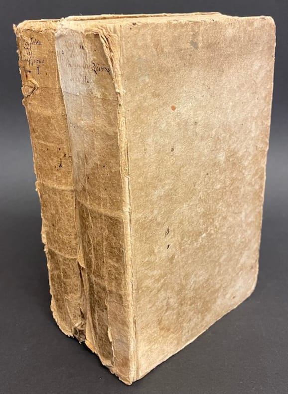 Modeste reliure légèrement postérieure frottée, charnières fragiles et 1er plat du Tome 2 détaché; quelques piqûres. Ex-libris armorié non identifié (couronne comtale avec initiales E. J.). ( Reu-Bur)