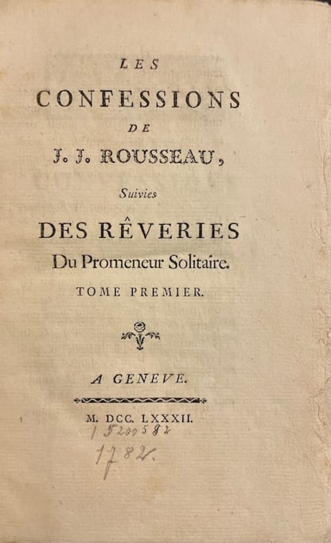 Contrefaçon parue la même année que l'originale de la première partie des Confessions de Rousseau [Gagnebin 1895/7]. Bon exemplaire.