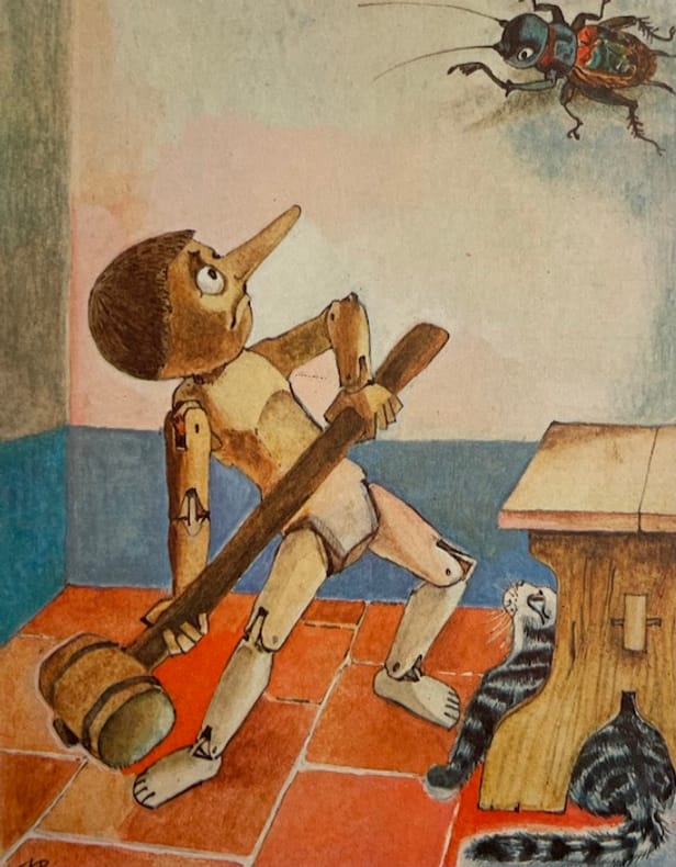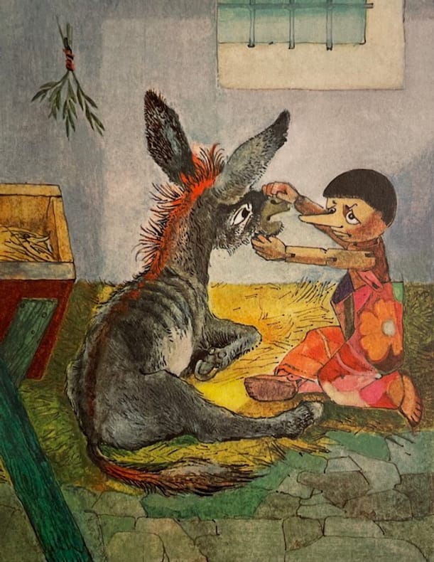 Les aventures de Pinocchio. Histoire d'un pantin. Illustrations de Alberto Longoni. Traduction française de Henri Louette. (Milano: Vallardi Industrie Grafiche, 1970). [M.C.: livre illustré moderne]