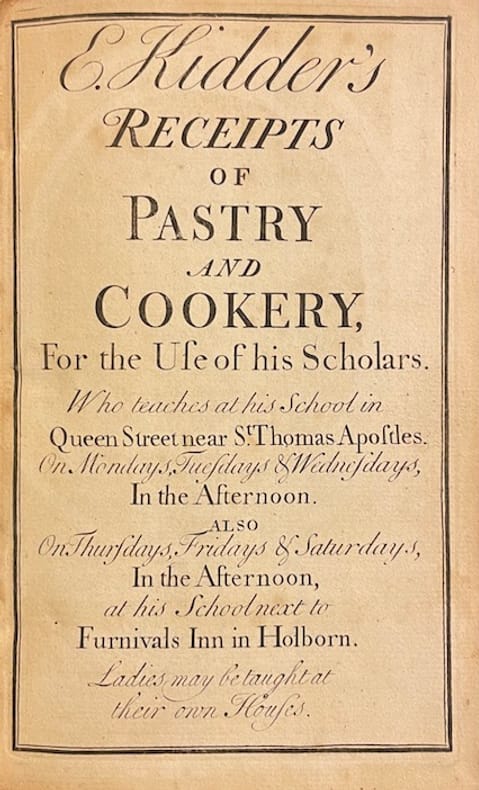 Avec un portrait de Kidder (avec perruque) gravé par Rob. Sheoppard en frontispice, page de titre, quarante feuilles de recettes, feuille « the order for bill of fare » (ordre des plats), feuille d'index et huit planches gravées, dont trois sont dépliantes. Toutes les feuilles sont imprimées uniquement au recto. Chaque feuille est en fait une gravure sur cuivre.