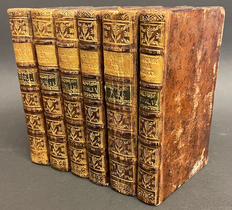 A Amsterdam et à Leipsick, chez Arkstée et Markus, 1764. 6 volumes in-8°, 444; 432; 420; IV-388; 499; ii-314p. Reliure plein veau d'époque, dos à nerfs orné de fleurons dorés, pièce de titre beige.