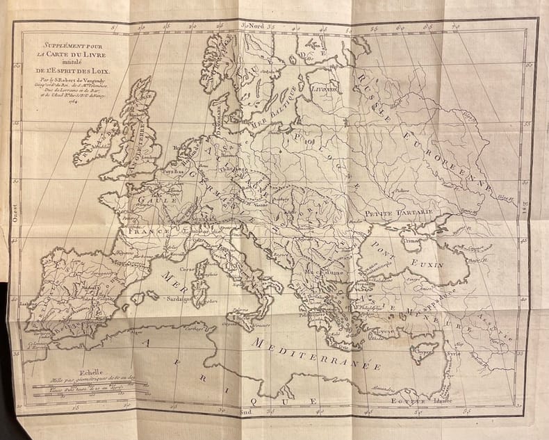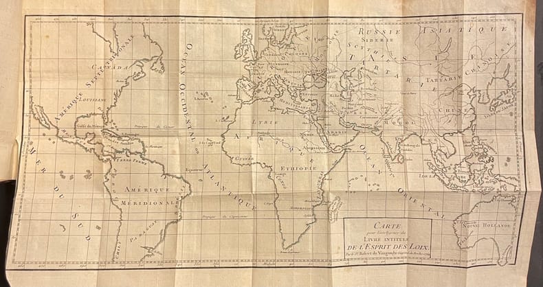 Avec des Remarques Philosophiques et Politiques d'un Anonyme qui n'ont pas encore été publiées.Bien complet des deux grandes cartes dépliantes servant à aider la compréhension de "L'Esprit des Loix"" qui forme les quatre premiers volumes de cette série. Ex-libris de François Béat Borel dans chaque volume. Très bel exemplaire.