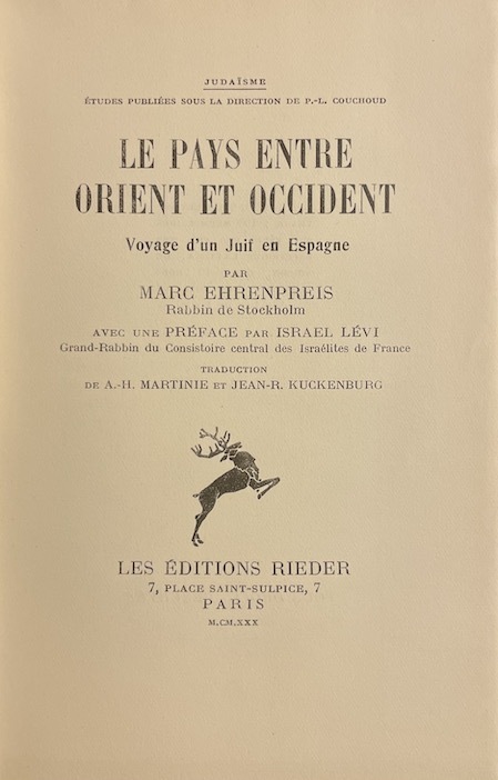 'Judaïsme', XII, Oeuvres publiées sous la dir. de P.-L Couchoud. Par marc Ehrenpreis, Rabbin de Stockholm. Avec une Préface par Israel Lévi, Grand-Rabbin du Consistoire centrale des Israélites de France. Trad. de A.-H. Martinie et Jean-R. Kuckenburg. Classification Dewey : 296-Judaïsme