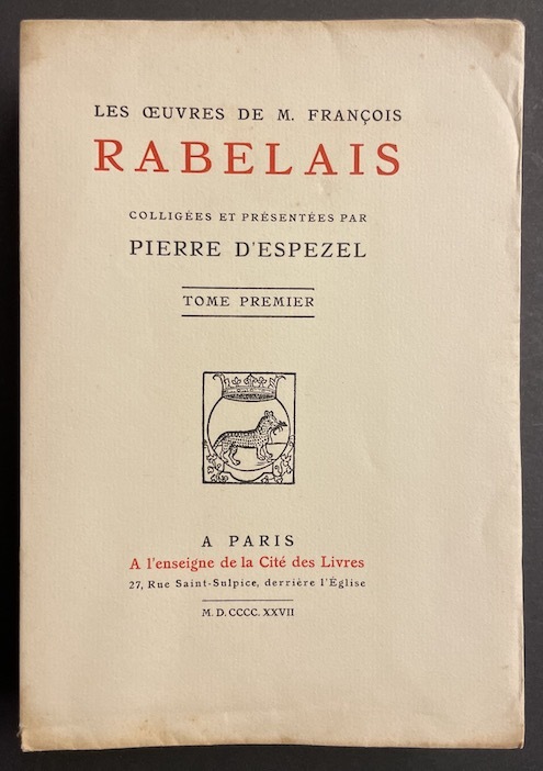 Nouvelle édition. Pages de titre en rouge et noir. Sphère armillaire au titre du tome I, fleuron ou chiffre au second tome. Figure gravée sur bois de la "Dive Bouteille", Tome II, p.327. Reliure en plein veau brun d'époque. Dos à nerfs orné. Pièce de titre de maroquin fauve, pièce de tomaison de veau fauve. Un manque en tête du tome 1. Epidermures sur les coiffes et nerfs. Ensemble frotté. Quelques rousseurs. Bon ensemble. Ces oeuvres contiennent : La Vie de François Rabelais ; Particularités de la vie et moeurs de François Rabelais ; Prologue de l'auteur ; I. Livre de la vie, faits et dits héroïques de Gargantua ; II. et III. Livres des faits et dits héroïques de Pantagruel ; T.II : IV. Livre de la vie, faits, &c. de Pantagruel ; V. Livre des Navigations dudit Pantagruel, l'Île Sonnante, l'Île des Apedestes, avec l'Oracle de la Dive Bacbuc & le mot de la Bouteille ; Pantagrueline pronostication [chapitres I-X] ; Epître du Limousin Pantagruel ; La Crème philosophale ; Deux épîtres à deux vieilles de différentes moeurs ; Alphabet de l'auteur François. - Photographies et détails sur www.Edition-Originale.com -