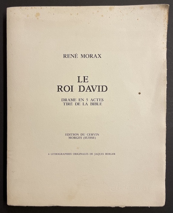 L'un des 120 exemplaires numérotés sur Johannot signé et justifié par l'artiste. Illustré de quatre lithographies originales de Jaques Berger, tirées par l'Atelier Carré. Fac-similé de l'exemplaire original annoté par l'auteur en vue de l'adaptation scénique de ce "Drame en cinq actes tiré de La Bible", créé au Théâtre du Jorat le 11 juin 1921, sur une musique d'Arthur Honegger. Quelques rousseurs sur la page de couverture, sinon bel exemplaire.