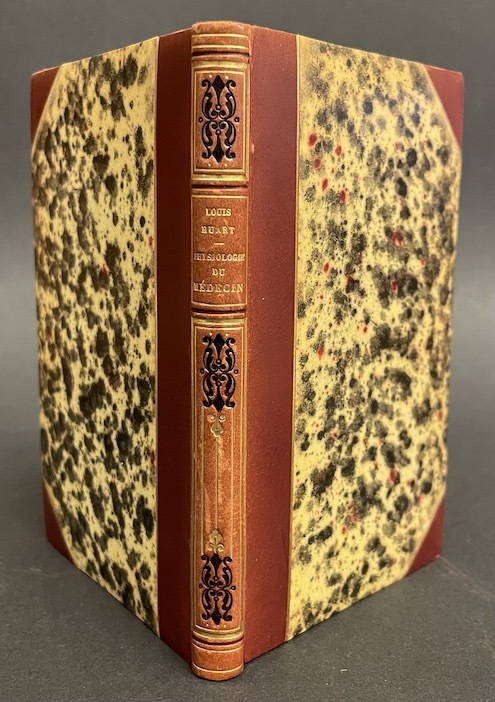 SILVIUS physiologie du poète in 16 frontispice, titre illustré, 124 pages, 1 page de table des matières, 1 page de catalogue, 55 vignettes dans le texte, culs de lampe, lettrines, ainsi que le frontispice, de DAUMIER. Paris Jules LAISNE éditeur Aubert & Cie 1843. Une trace de colle séchée en long du frontispice (qui est doublé) Suivie de Louis HUART physiologie de l’étudiant. Faux-titre, titre illustré, 122 pages, 64 vignettes dans le texte, lettrines, culs de lampe. Une trace de colle séchée en long de la page de faux-titre. Aubert & Cie 1841. Suivie de Louis HUART physiologie du médecin Faux-titre, titre illustré, 123 pages 66 vignettes lettrines, dans le texte, culs de lampe de TRIMOLET. Aubert & Cie sans date. Suivie de P. BERNARD Physiologie du député. Deux parties. 64 et 56 pages. 18 vignettes de Henry EMY, la plupart hors-texte. Paris Raymond BOCQUE 1841. L’ensemble en un volume demi-chagrin rouge à grain long et à nerfs, titre doré.