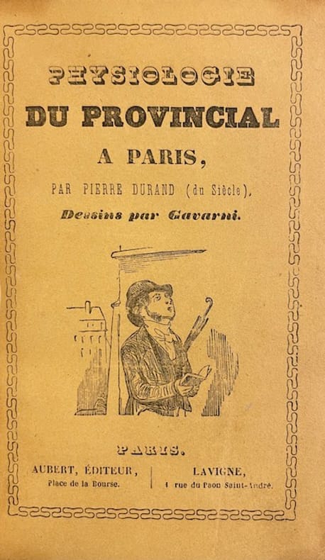 Paris, Aubert et Cie; Lavigne, s.d. (1841), in-32, 121 pp, Broché, couverture beige illustrée en noir, Édition originale de ce petit ouvrage dépeignant avec humour le provincial à Paris. C'est l'oeuvre d'Eugène Guinot, journaliste à la Revue de Paris et au Siècle, et de Gavarni, qui fournit ici de petites vignettes dans le texte mettant en scène le provincial dans ses péripéties parisiennes. Complet du catalogue de l'éditeur in fine. Minuscules déchirures marginales à la couverture, quelques petites rousseurs. Lacombe n° 620. Lhéritier n° 49. Vicaire, VI, 613. Couverture rigide
