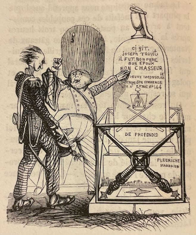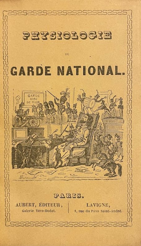 Troisième édition.La Garde nationale parisienne, sous la Monarchie de Juillet, est à la fois une vache sacrée (sa suppression par Charles X avait préfiguré les Trois glorieuses) et un objet de raillerie sur son utilité de moins en moins perceptible."Nous voulons entreprendre la réhabilitation de la Garde nationale ; une foule de gens, mal intentionnés, prétendent qu'elle ne sert à rien ; en tenant ce propos léger, ils oublient qu'elle aura servi quelquefois à les faire rire ; or, n'eût-elle servi qu'à cela, ce n'est pas déjà peu de chose, le rire est une chose excellente pour la santé ; ainsi, vous voyez bien que prise seulement au point de vue hygiénique, l'institution de la Garde nationale serait encore une oeuvre de philanthropie." - - VENTE PAR CORRESPONDANCE UNIQUEMENT