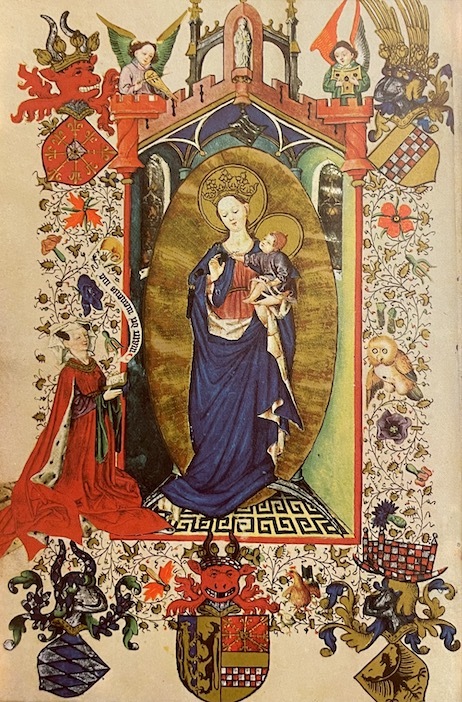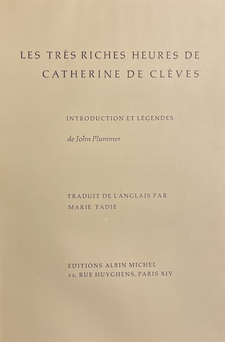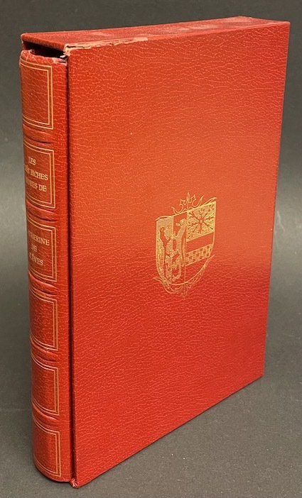 1967 Paris: Albin Michel, 1967. 14.5 x 21 cm, 358pp. Reproduites d'après le manuscrit enluminé appartenant à la Collection Guennol et à la Bibliothèque Pierpont Morgan. Ouvrage tiré à 4000 exemplaires numérotés (no. 1456). Reliure plein similicuir rouge. Dos à 5 nerfs avec titre en lettres dorées; plats à double encadrement, plat sup. orné des armes de Catherine de Clève. Sous emboitage plein similicuir rouge portant les mêmes armes. Exemplaire comme neuf.