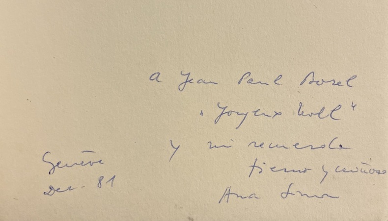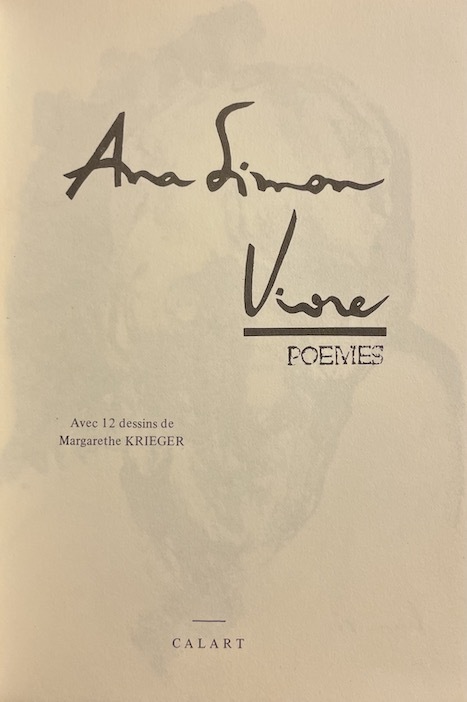 Vingt-six poèmes d'Ana Simon illustrés de 12 dessins de Margarethe Krieger. Premier recueil de poèmes d'Ana Simon, artsie au talents multiples, épouse de l'acteur François Simon, traductrice de Mircea Eliade, cinéaste. Exemplaire enrichi d'un envoi autographe signé de l'autrice.