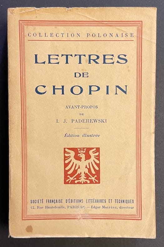 Paris Société Française d'éditions littéraires et techniques 1933 in 12 (19x12,5) 1 volume broché, couverture imprimée, 591 pages, avec des illustrations hors-texte, petite fente au dos. Recueillies par Henri Opienski et traduites par Stéphane Danysz. Avant-propos de I. J. Paderewski. Edition complète comportant des lettres et des documents inédits, ainsi qu'un index des oeuvres de Chopin citées et commentées par l'auteur dans ses lettres. Collection Polonaise. Celui-ci un des 100 exemplaires numérotés sur papier pur fil, seul grand papier. Bon exemplaire ( Photographies sur demande / We can send pictures of this book on simple request )