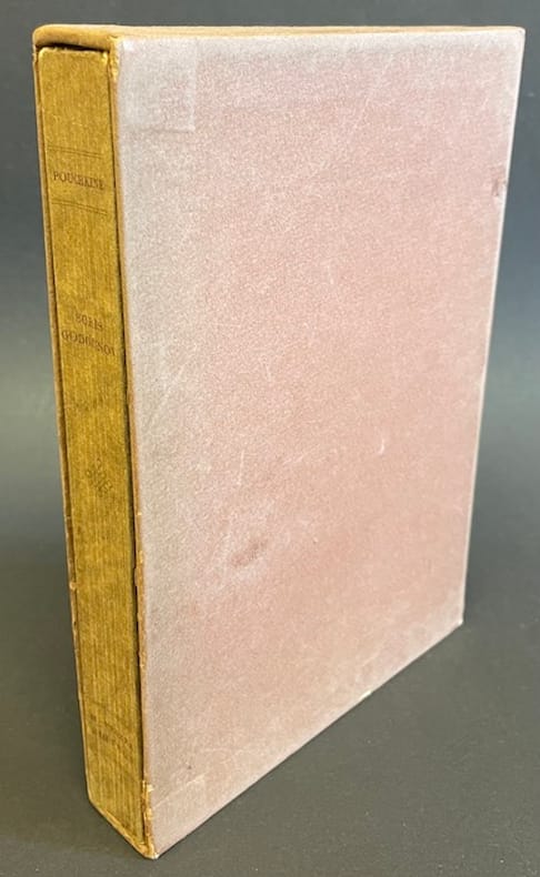 L'éditeur René Kieffer aimait publier des suites d'illustrations seules afin de les proposer aux amateurs qui lui confiaient des livres à relier. Pour certains des titres de sa collection économique "l'amour des livres" (20 titres in-8 parus de 1923 à 1932, tirage à 800 ou 1050 exemplaires) pour laquelle l'illustration consistait souvent en une simple décoration géométrique, il a fait composer, à part, une illustration plus luxueuse, par de jeunes artistes dont le nom n'était pas mentionné dans le livre imprimé et qui ne signaient pas leurs planches. Ce procédé commercial permettait à Kieffer non seulement de proposer des illustrations supplémentaires à ses clients plus fortunés mais également d'enrichir de gravures d'autres éditions des même texte qu'on lui confiait à relier. Pour ce qui concerne les illustrations de Dufour pour Boris Godounov, on trouve certains exemplaires de l'édition de 1928 avec, au choix, l'état en couleurs (non présent ici) et le dernier état en noir, généralement tirés sur vélin. Il est extrêmement rare de trouver ces suites tirées sur Japon, à part, et surtout avec les trois premiers états. Il est à noter que, les planches n'étant ni signées ni monogrammées et demeurant inconnues des bibliographes (quoique mentionnées par Grolier), la plupart des amateurs ou des confrères qui disposent d'un exemplaire avec l'une de ces suites pensent que ces illustrations sont de Georges Braun. Nous serons heureux qu'ils apprennent quelque chose en lisant notre fiche ! Les planches du deuxième état sont tirées sur un papier Japon plus mince que les autres, le 3e état est tiré sur Japon ancien. Bel état. (Inconnu de Monod comme de Carteret) Très bon