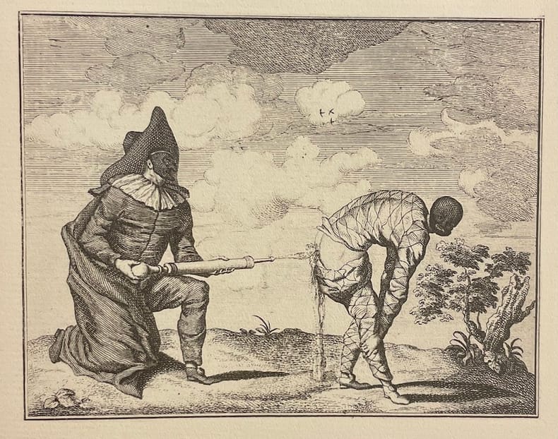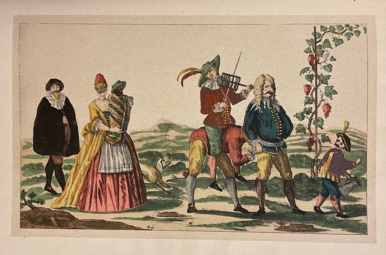BRUNELLESCHI Les masques et les personnages de la Comédie Italienne. Expliqués par GERARD D’ HOUVILLE et interprêtés par BRUNELLESCHI en douze estampes coloriées. A Paris aux bureaux du journal DES DAMES ET DES MODES éditeur 1914. Edition numérotée :Un des Exemplaire sur vélin d'Arches, numéroté à la plume à la plume. Faux titre en rouge, au verso justification du tirage, titre 5 pages, dont 4 d’introduction par GERARD D’ HOUVILLE « celles dont le portait n’est pas là » et Suite de douze estampes superbement coloriées au pochoir d’après BRUNELLESCHI gravées par REIDEL. 1) Arlequin 2) le docteur Balanzone 3) Brighella 4) Coralline 5) Florindo 6) Giacometta 7) Mezzetin et colombine 8) Pantalon 9) Rosauro10) Scaramouche 11) Tartaglia 12) Trivellino. Chemise avec titre imprimé- portefeuille cartonné à rabats, l’ensemble dans un étui cartonné pièce de titre imprimée en long contrecollée. Fermoirs à rubans absents. 510x380mm fermé- 105x380 ouvert. Quelques traces d’usures à l’étui. Cet ouvrage a été chevé d’imprimer pour le Journal des Dames et des Modes le 10 mars 1914, par les soins de MM. BRAUN pour les estampes GRENIN Gaine Fils & Cie pour les coloris POZZOLI pour la typographies qui a été exécutée avec les caractères M OLDIER & Cie. Chef d’œuvre emblématique de BRUNELLESCHI.
