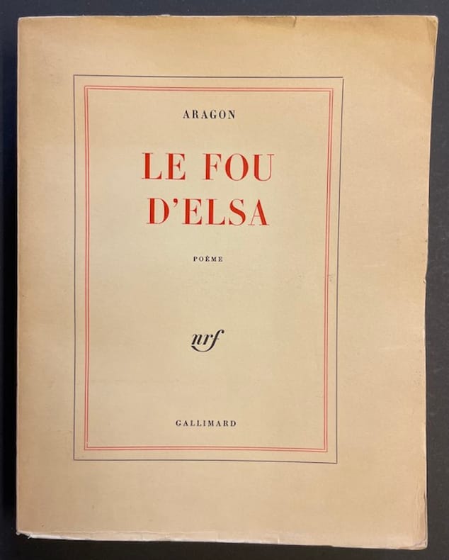 Le Fou d’Elsa - Louis Aragon - Gallimard 1963 1 volume broché format 19 x 23,5 - couverture souple - 458 pp. - 1ère édition sur papier courant - envoi autographe de l'auteur en page de faux-titre État correct, couverture défraichie (dos bruni et plissé, rousseurs aux plats, fente au bord supérieur du 1er plat et plissures dans le coin inférieur), reliure toujours solide et intérieur frais.