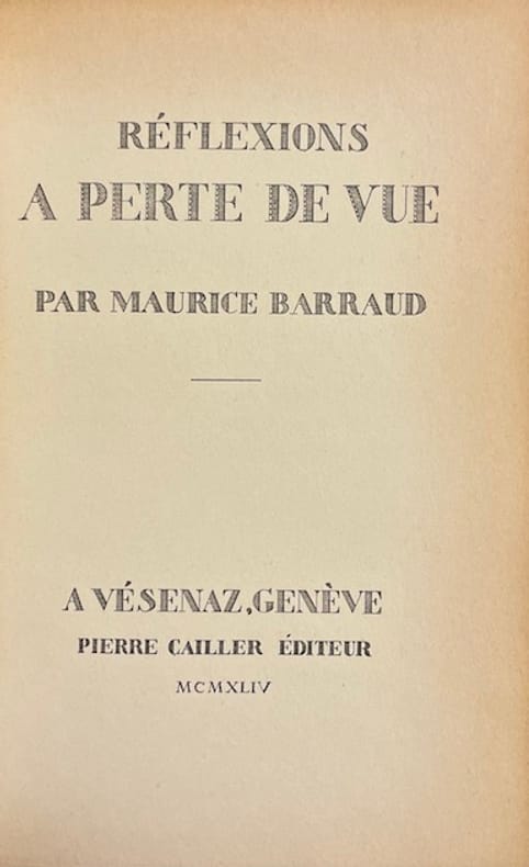 Genève, Pierre Cailler, 1944. Pt. in-8°, 252p. Reliure muette plein parchemin, avec un dessin original de Barraud au dos, couverture conservée.