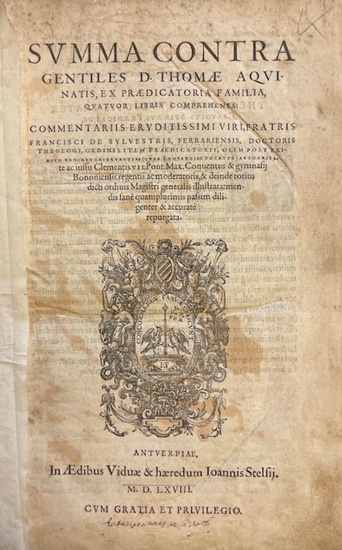 Edition particulièrement intéressante car elle inclut les commentaires d'un autre grand théologien dominicain, Francesco Silvestri (aussi appelé Franciscus de Sylvestris ou Ferrariensis). Très bel exemplaire dans sa reliure souple d'époque. Quelques commentaires et soulignements marginaux.
