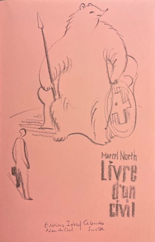 Neuchâtel, Ides et Calendes, 1970. In-12 broché, couverture rappelant un autre livre, publié lui par le Conseil fédéral suisse - vous voyez ? Couverture un peu frottée en bord, avec quelques plis, dos fendu. Illustré à toutes pages par Marcel North et légendé en fac-similé autographe.