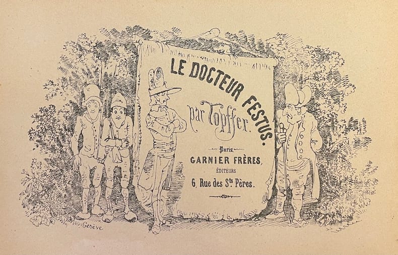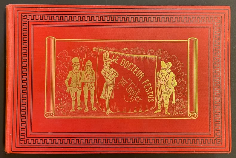 88 pages illustrées par TOPFFER, à la mode d'une bande dessinée ancienne, narrant les périgrinations et autres aventures du Docteur Festus, au XVIIIe siècle. Une histoire badine illustrée de dessins expressifs. Us. mors., accrocs au dos près des tranchefiles inférieur et supérieur.