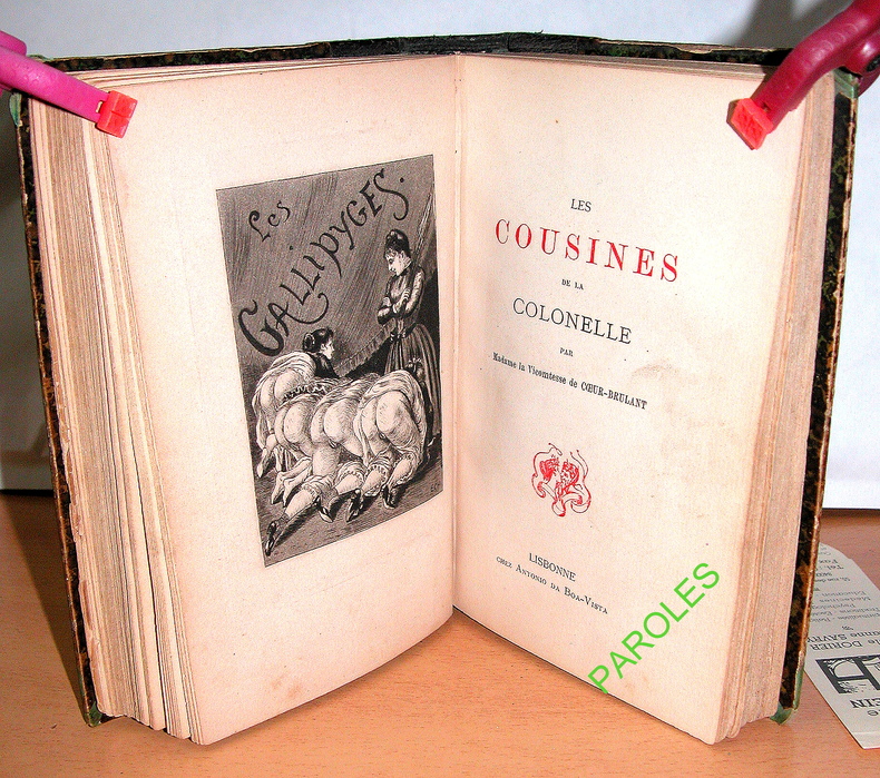 Lisbonne, chez Antonio da Boa-Vista [Bruxelles, Gay et Doucé], Lisbonne, chez Antonio da Boa-Vista [Bruxelles, Gay et Doucé][1880 ou 1882] ; petit in-8, demi-chagrin vert, dos à 5 nerfs, titre doré, tête dorée, non rogné. (Reliure de l’époque) État non décrit par Dutel 175. Il s'agit probablement de l’édition originale publiée par Gay et Doucé. Le titre est identique et il porte la même justification “imprimée à 500 exemplaires” (celui-ci porte le n°142) imprimé également sur papier vergé à pontuseaux verticaux. Les détails de foliotation correspondent à l’état A décrit par Dutel 175, mais le bandeau en tête du premier chapitre ainsi que la première lettrine sont différents de ceux qu'il décrit. De plus cet exemplaire a 172 pp. (et non 171) et il n’a pas de frontispice.Célèbre roman pornographique qui fut d’abord attribué à Maupassant. Léon Deffoux puis Patrick Wallberg ont identifié l’auteur véritable, la Marquise de Mannoury d’Ectot, née Le Blanc qui avant la guerre de 1870 recevait dans son château normand situé près d’Argentan des artistes et des poètes, notamment Verlaine, Charles Cros, Charles de Sivry. Quelques années plus tard, ses conditions d’existence ayant changé, la marquise tint une agence matrimoniale à Paris et se lança dans l’écriture de romans cochons. Grâce à ses anciennes relations, elle approcha Kistemaeckers. Celui-ci ne publia point Les cousines de la Colonelle mais transmit le manuscrit à Gay qui la publia.En 1882, Melle Doucé publiera à Paris une seconde partie de ce roman. - Dutel 175 (Exempl. B) - Perceau. Bibl. du roman erotique au XIXe, I, p. 180 n°48-1 - Pia I, col. 270 - Duprilot. Gay et Doucé, pp. 144-146.Bel exemplaire frais.