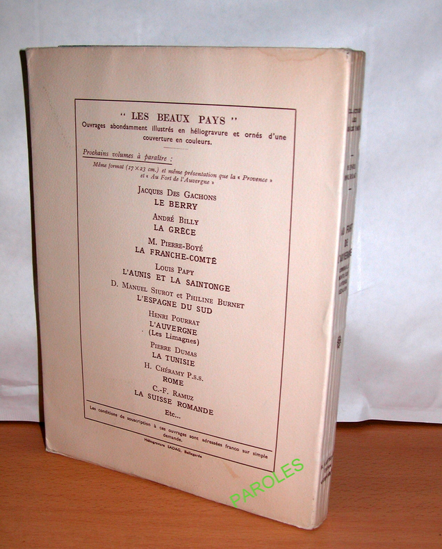 1ère édition (après 200 exemplaires sur vélin) de cette description de la région par l'écrivain auvergnat Henri POURRAT (1887-1959), illustrée de "150" (annoncées) photos en héliogravure; 1er plat de couverture illustré couleurs d'après aquarelle de F. ANGELI. Exemplaire bien complet de sa carte du Puy de Dôme en tiré à part. Bon état sauf bandes jaunies en 1ère et dernière pages (décharges des rabats ?); très bon état intérieur.