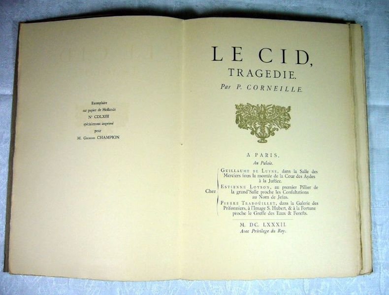 Deuxième édition de l'une des pièces principales de la "Querelle du Cid" avec, au verso du dernier feuillet, l'extrait du privilège du 26 novembre 1637 de l'édition originale publiée par Jean Camusat en 1638. Créé en janvier 1637, imprimé dès le mois de mars suivant, "Le Cid" remporta un immense succès mais se heurta également à des critiques acerbes, qui passionnèrent lopinion. Corneille ne respectait pas les règles du théâtre classique, entre autres la règle des trois unités. En un an, près dune quarantaine dopuscules pour ou contre Corneille virent le jour. Scudéry, auteur d' "Observations sur le Cid", suggéra dans sa "Lettre à l'illustre Académie" que la pièce fût jugée par l'Académie française. Le cardinal de Richelieu, séduit par l'idée, pria l'Académie qu'il avait créée en 1634 de nommer plusieurs commissaires chargés d'examiner la pièce. Cinq mois et trois versions plus tard, la première et la troisième révisées par Chapelain, Richelieu accordait l'autorisation d'imprimer. « Cet ouvrage fut digne de la grande réputation de cette Compagnie naissante. Elle sut conserver tous les égards quelle devait et à la passion du cardinal et à lestime prodigieuse que le public avait conçue du Cid. » (Fontenelle). L'Académie termine ainsi ses "Sentimens sur Le Cid" : « La naïveté et la véhémence de ses passions, la force et la délicatesse de plusieurs de ses pensées, et cet agrément inexplicable qui se mêle dans tous ses défauts lui ont acquis un rang considérable [...]. » Guez de Balzac enfin, mettra son autorité morale et littéraire au service dune vue comparable lorsquil écrira à Scudéry, au début de 1638, que « toute la France » est avec Corneille et que la beauté du Cid est de lordre de la « Magie ». Corneille ne se présenta à lAcadémie quaprès la mort de Richelieu et ny sera élu quà sa troisième candidature en 1647. Picot : Bibliographie des uvres de Pierre Corneille, 1381 - Jacques Schérer : La Querelle du Cid Pellisson : Relation contenant lHistoire de lAcadémie française (1653), cité dans Bibliothèque M.D. : Corneille (Rouen, 1993), n° 66 (pour loriginale).