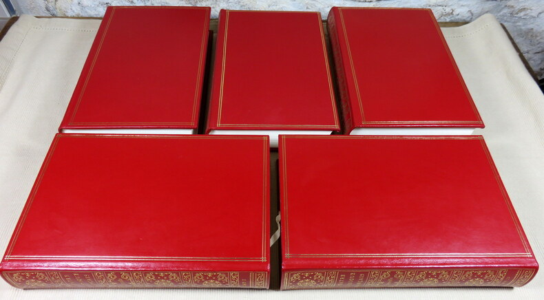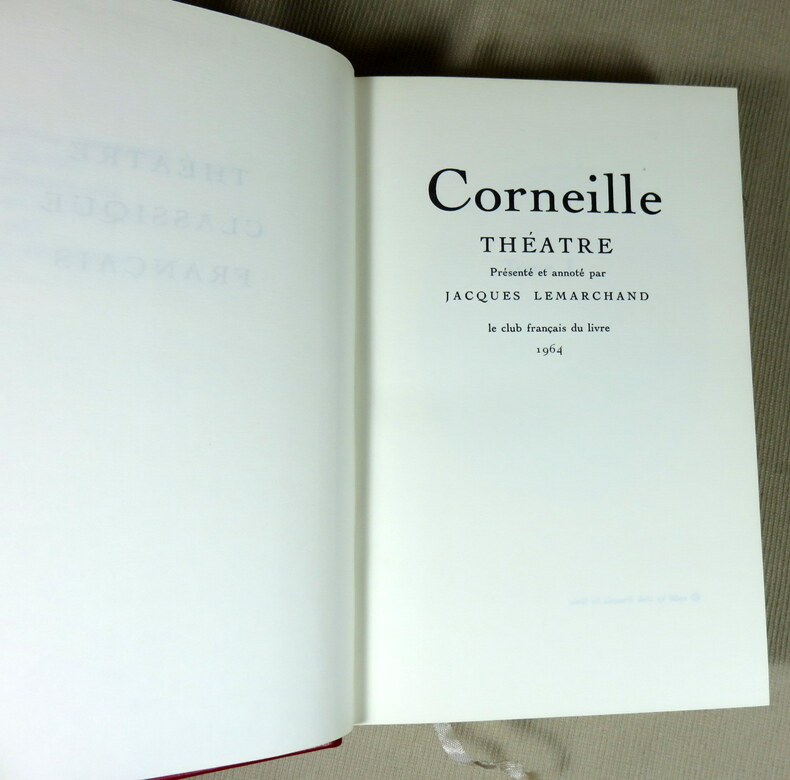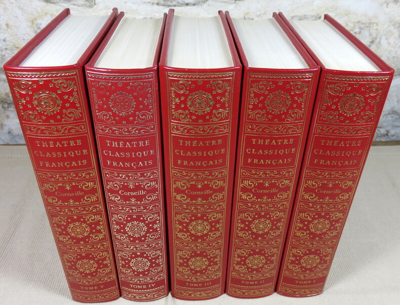 Complet en cinq volumes, reliures cuir de l'éditeur, signets, 21X14 cm, 1964, édition établie par Jacques Lemarchand, papier vergé à l'antique des papeteries Arjomari, fait partie de la collection "théatre classique français" en 12 volummes (Les tomes 1 à 5 sont consacrés à Corneille, les tomes 6 à 10 à Molière et les tomes 11 et 12 à Racine), le club français du livre. Marques mineures, bon ensemble.