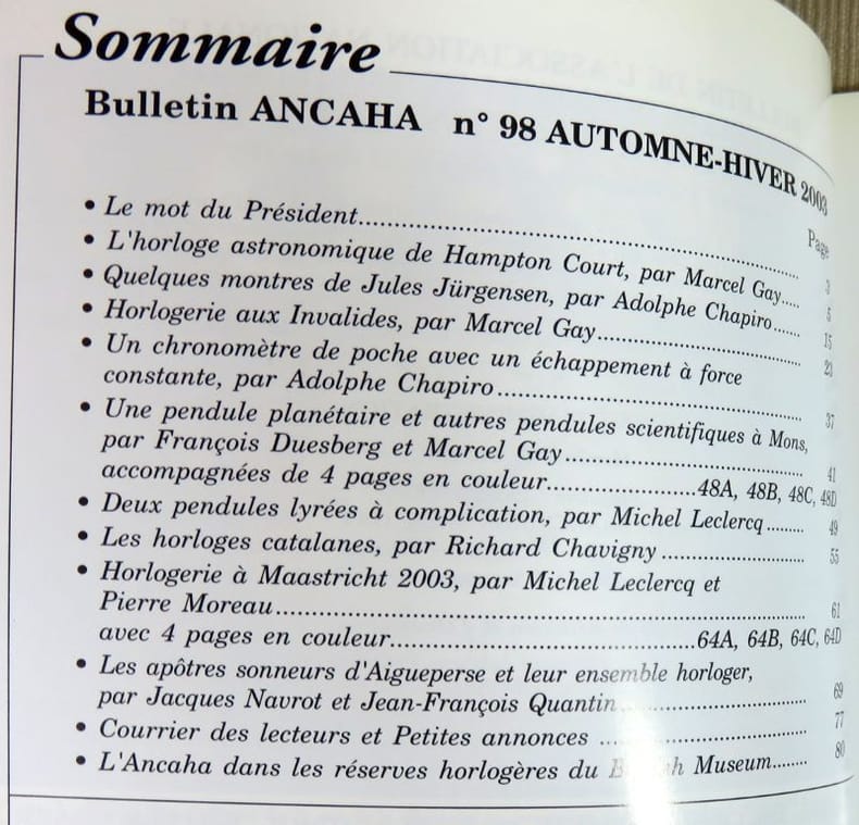 Broché, 23X16 cm, 2003, N° 98, 80 pages, illustrations en noir et en couleurs, revue de l'association nationale des collectionneurs et amateurs d'horlogerie ancienne et d'art. Très bon état.