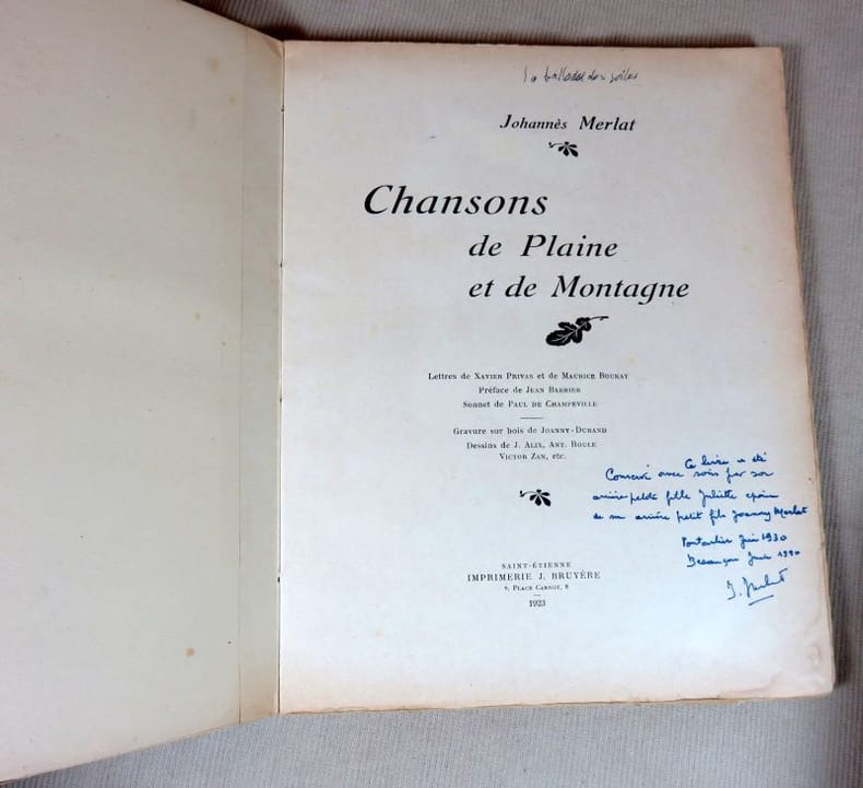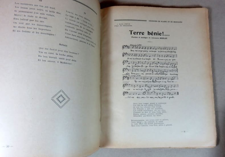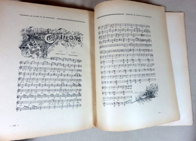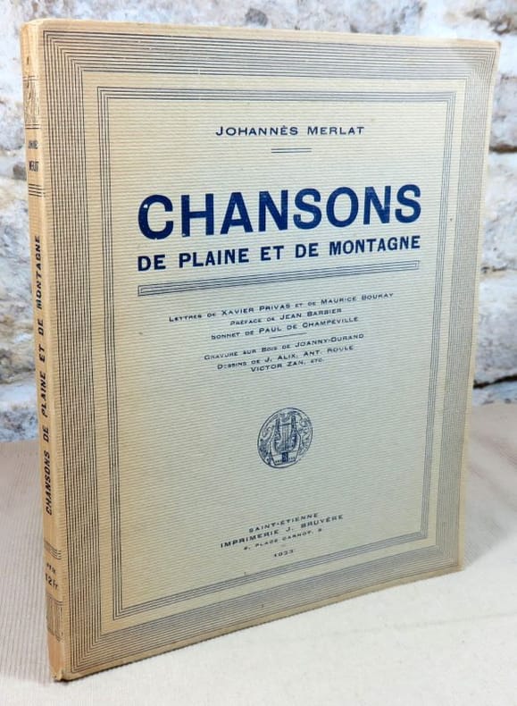 Broché, 25X20 cm, 1923, 205 pages, portrait de l'auteur en frontispice (bois gravé), texte et partitions des chansons, imprimerie J. Bruyère. Deux articles de journaux collés en début d'ouvrage, quelques inscriptions au stylo, bon état.
