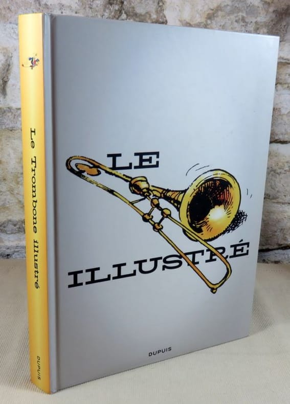 Editions Marsu Productions / 2005. In-8 cartonnage éditeur illustré à l'Italienne de 62 pages au format 30,5 x 22 cm. Couverture et recueil des 26 illustrations de titre réalisées par André Franquin pour les 30 numéros publiés dans la revue " Le Trombone Illustré ". Dossier de 6 pages de présentation en introduction et textes d'Yvan Delporte. Petit tassement et minuscule frottis en haut et bas du dos, sinon superbe état de fraicheur. Exemplaire sous blister. Tirage unique à 6000 exemplaires numérotés et tirés sur couché. Rare édition originale, totalement épuisée.