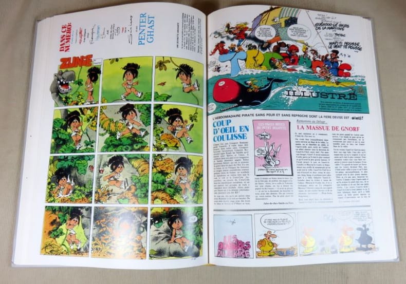 1980, Dupuis, in-folio cartonné, couverture blanche illustrée en couleurs, planches en noir et blanc, 240 pages, 53 auteurs, 150 récits complets, «les 30 exemplaires parus du fameux supplément clandestin de Spirou « | Etat : état correct, couverture défraîchie et jaunie, coins et coiffes abimés, rousseurs sur les gardes, tranches jaunies (Ref.: G4740)